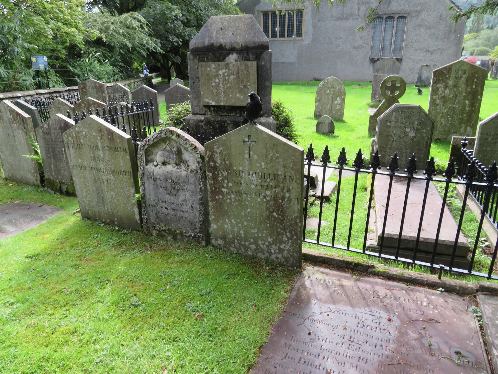 Wordsworth’s grave in Grasmere. The crow was real, not decorative. Wordsworth's stone is on the far left. His daughter’s, Dora, is in the center.